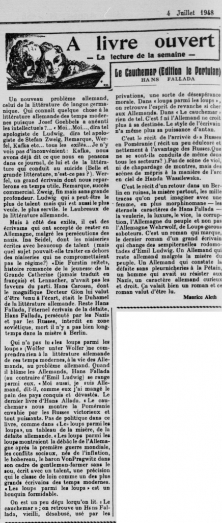 Voici une nouvelle recension du dernier roman de Hans Fallada, parue dans AEF, l'organe bi-hebdomadaire de défense et de propagande de l'Afrique équatoriale française (Brazzaville), dans le n° 458 du dimanche 4 juillet 1948.